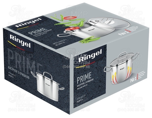 Все кастрюли RINGEL производятся по новейшей технологии хранения тепла. Утолщенное капсульное дно быстро и равномерно передает тепло блюду, что позволяет сократить время на приготовление и сохранить максимум полезных веществ в блюдах, а утолщенные стенки кастрюль RINGEL обеспечивают максимально долгое удержание теплого блюда, без необходимости дополнительного разогрева. Коллекция Prime отличается зеркальным внешним и внутренним покрытием и мерной шкалой, благодаря чему можно легко, быстро и точно отмерить объем жидкости для приготовления. К преимуществам можно отнести функциональную крышку, которая оснащена отверстием для выпуска пара и металлическим ободком, который обеспечивает долговечность продукции.