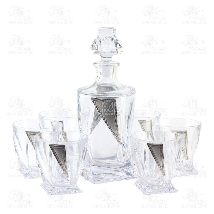 Уже более четверти века итальянский бренд Linea Argenti создает оригинальные декоративные изделия из серебра и золота. Они производятся с учетом давних ремесленных традиций и современных технологий, благодаря чему получаются настоящие произведения искусства. В данный набор для виски входят графин и шесть стаканов. Их отличительной особенностью является уникальный дизайн. Лаконичные линии графина создают эффект четкости и изящности. Изделия украшены серебряными накладками в форме треугольников, которые подчеркивают оригинальную геометричность набора. Накладки покрыты серебром 925 пробы гальваническим способом слоем 15 микрон.