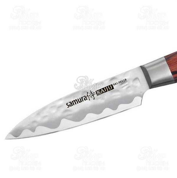 Маленький нож с коротким прямым лезвием. Один из самых нужных на кухне ножей (входит в «поварскую тройку»). Очень удобен для чистки овощей и фруктов и нарезки небольших продуктов. Японская нержавеющая cталь AUS-8, из которой изготовлен нож, обладает хорошей коррозионной устойчивостью, отличной стойкостью режущей кромки, легко полируется и шлифуется. Необычная финишная отделка лезвия создает во время реза воздушную подушку, благодаря чему исключается налипание ломтиков продуктов при нарезке. Рукоять ножа, выполненная из дерева, удобно лежит в руке, не скользит и устойчива к агрессивным средам. Samura "KAIJU" - это коллекционные ножи современного дизайна, которые станут истинным украшением на любой кухне .