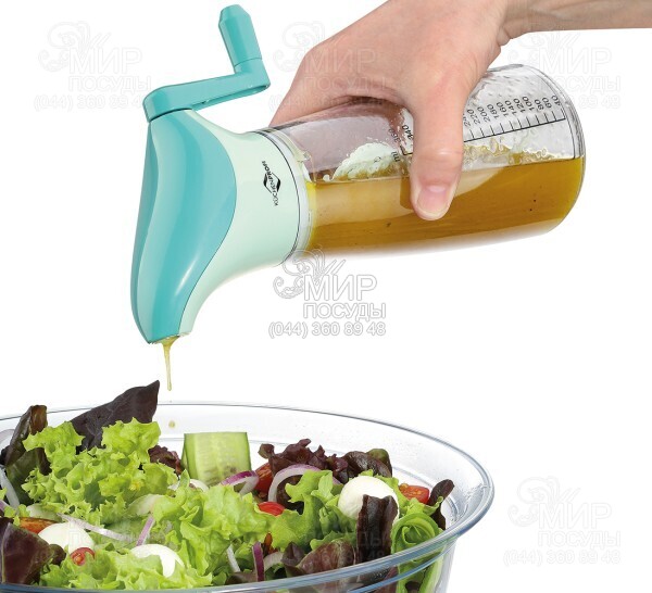 Приспособление для смешивания от немецкого производителя Kuchenprofi изготовлено из пластика. Емкость имеет удобную шкалу для измерения жидкости. Вмешайте яичный желток, горчицу, йогурт или пахту легко вращающейся рукояткой. Крышка с плотным силиконовым уплотнением имеет сливной носик. Заправка ложится именно на листья салата или маринованного лосося, а любители мяса смогут перемешивать свой секретный маринад для шашлыка.