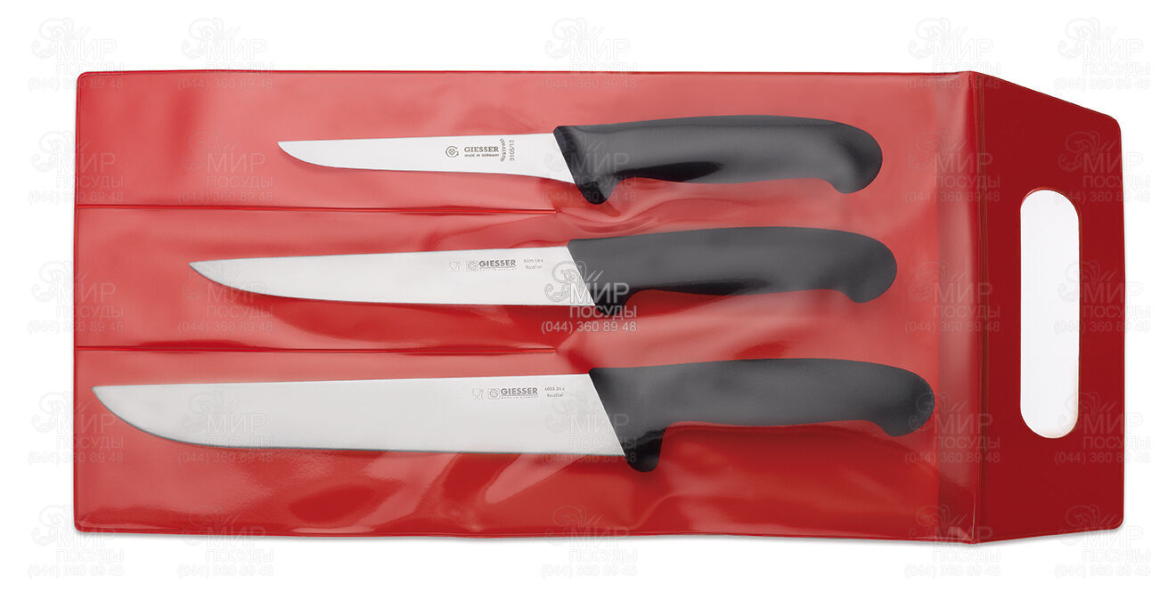 Ножи от немецкого производителя Giesse изготовлены из хромомолибденовой стали c добавками хрома и молибдена. Хром придает стали прочность, а молибден повышает износостойкость, гарантирует отсутствие хрупкости. Матово-полированная режущая кромка обеспечивает оптимальную устойчивость к ржавчине. Таким образом, ножи с самого начала идеально затачиваются, а финальная шлифовка или тонкое хонингование производится вручную. Рукоятки среднего размера выполнены из нескользящего материала, их удобно держать в руке.