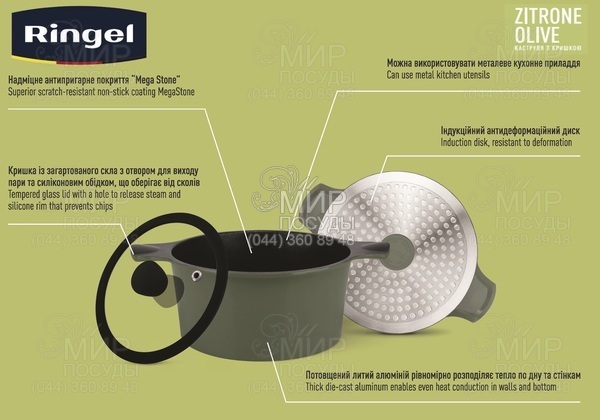 Кастрюля Zitrone от Ringel изготовлена из утолщенного литого алюминия и отличается супер прочным покрытием Mega-Stone - устойчивым к образованию внешних повреждений и царапин. К преимуществам, также можно отнести функциональную крышку, которая оснащена отверстием для выпуска пара и силиконовым ободком, который препятствует появлению сколов. В комплекте с кастрюлей идут две силиконовые прихватки в форме бабочки с магнитным держателем.