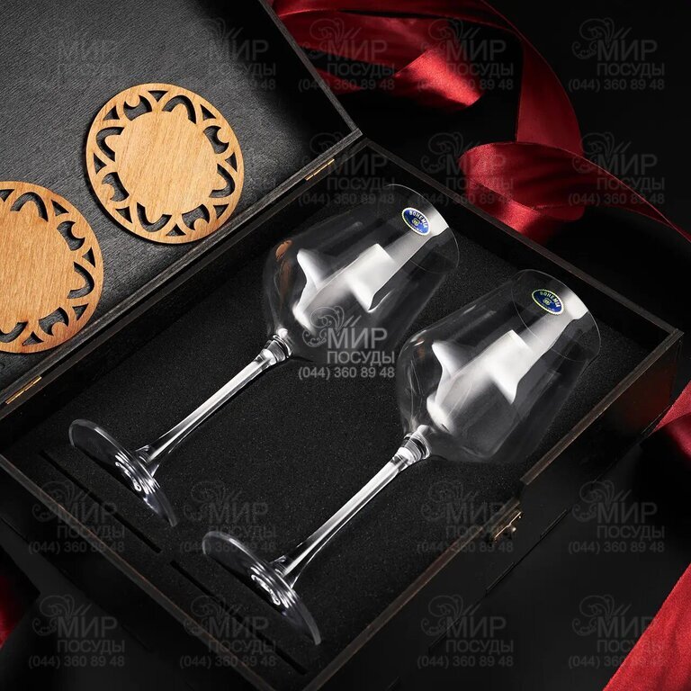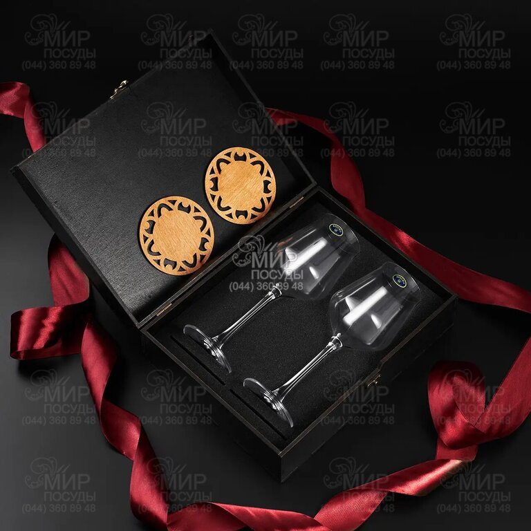 Качественная деревянная подарочная упаковка в темном дереве. Внутренняя часть - это мягкий бархатный ложемент, на котором размещены 2 бокала и 2 костера.