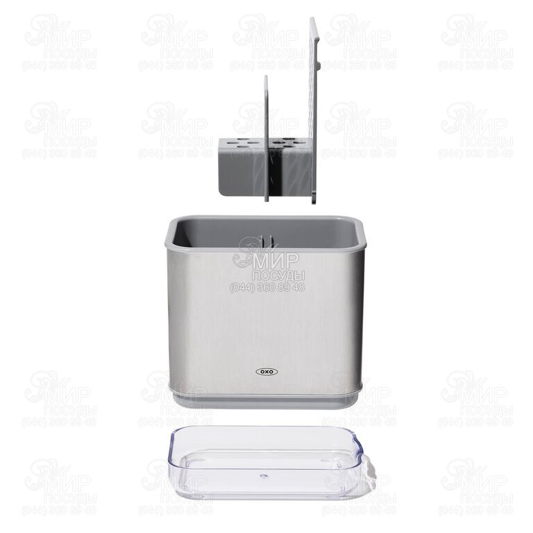 Органайзер для раковины ОХО разделен на 2 отсека для отделения губок для мытья посуды от чистящих щеток. Основание изделия перфорировано и снабжено съемным контейнером, который собирает воду, капающую из кухонных принадлежностей.