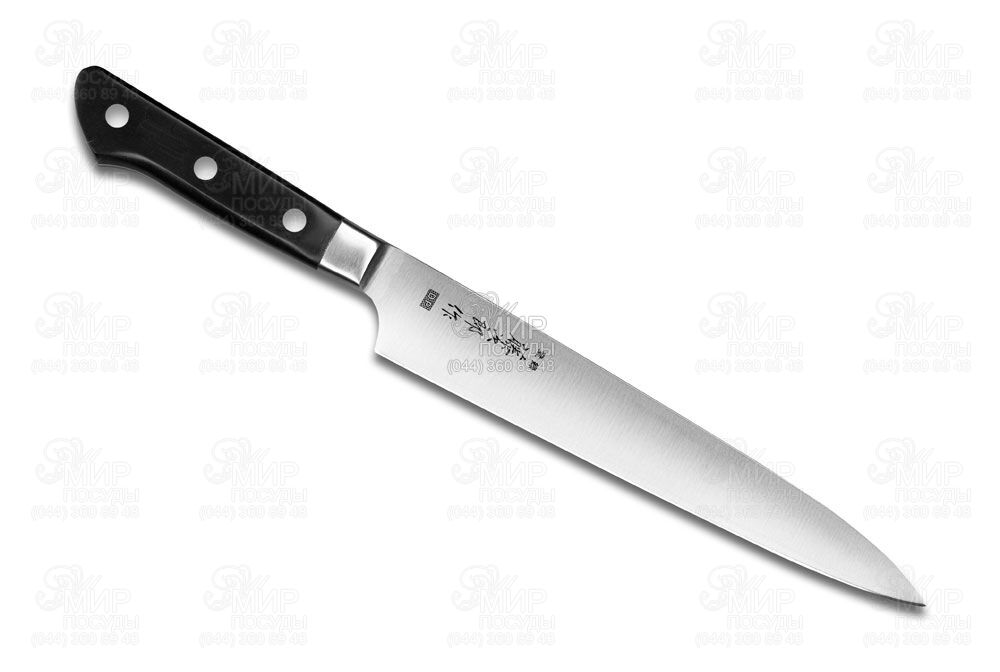 Тонкий нож большого размера, предназначенный для эффективной и быстрой нарезки, филеровки. Клинок выполнен из 3-х слоев нержавеющей стали VG-10, твердостью около 60 HRC, имеет форму Drop-point и несколько сглаженный кончик. Исключительно тонкой сведение граней и продуманная геометрия лезвия позволяет с легкостью нарезать и шинковать сложные продукты, выполняя эту кропотливую работу с поразительной быстротой. Ламинированная рукоять ножа изготовленная из черной микарты, рассчитана на повышенные нагрузки, долгую службу и противодействие бактериям, для которых кухня – это обычная среда обитания. Ее довольно тонкая, но удобная форма, обеспечивает надежный хват и полное послушание ножа даже в мокрых и жирных ладонях.