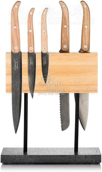 Искусная подставка для ножей от компании Laguiole Style de Vie изготовлена из светлого дуба и оснащена прочным магнитом, основание выполнено из натурального камня. Этот блок поставляется с 4 ножками - 2 черными и 2 серебряными.
