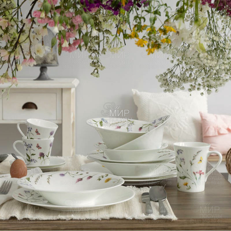 Кружка из коллекции Nora Spring Vibes от немецкого производителя Hutschenreuther изготовлена из костяного фарфора. Нежные колокольчики, незабудки, пурпурный клевер и желтые лютики изображены с большой любовью к деталям и выглядят на тонком сияющем Bone China как нарисованные. На каждой части посуды цветы умело располагаются индивидуально. На тарелках изящные растительные мотивы прижимаются к краю, на чашках они кажутся растущими вверх. В контрасте с этим на блюдцах украшает только одна маленькая бабочка.