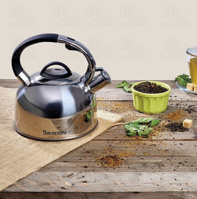 Чайник от итальянского производителя Barazzoni изготовлен из высококачественной нержавеющей стали 18/10, обладает высокой коррозионной стойкостью. Материал содержит 18% хрома и 10% никеля, такой состав делает изделие более долговечным. На чайнике есть кнопка для автоматического поднятия свистка.