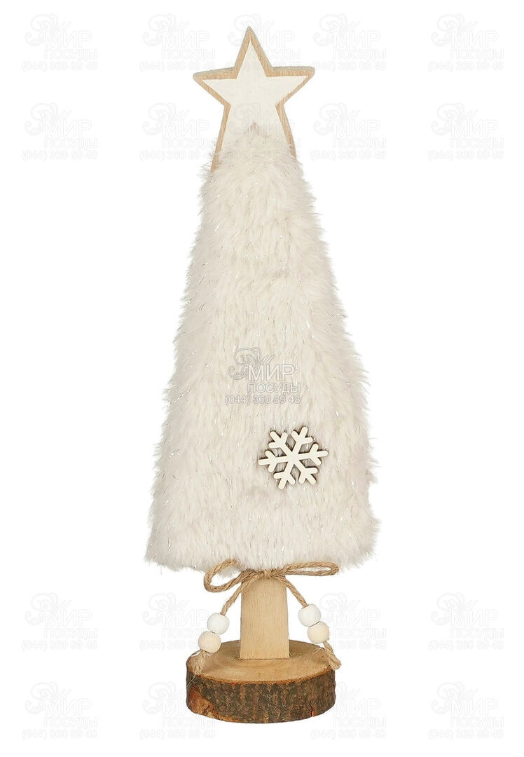 Настольная деревянная фигурка в виде ёлки со звездой, украшенная мягким искусственным мехом с блестящими элементами и снежинкой на нем. Стильный цвет изделия айвори ассоциируется со сказочностью и хрупкостью. Благодаря подставке из деревянного среза украшение найдет свое место на столе, подоконнике или тумбе, излучая уют и позитив вокруг. Бантик из жгута с бусинками на концах придает изделию своеобразную подлинность.