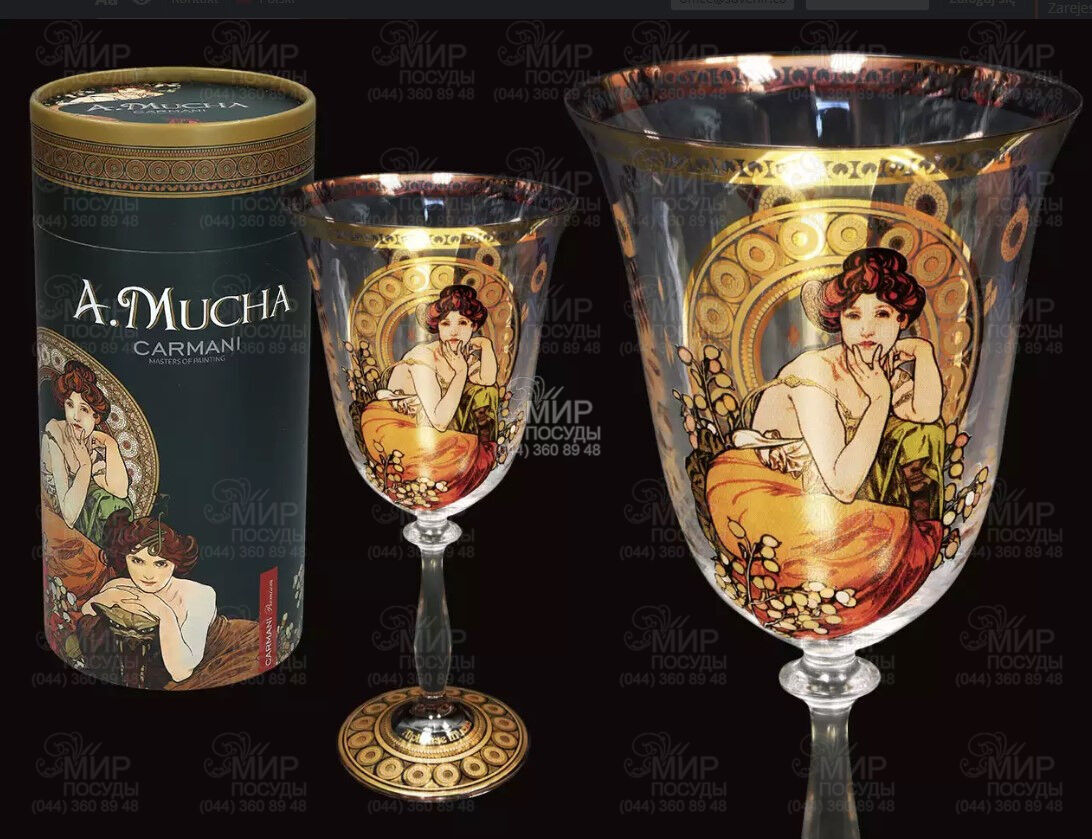 Емкость выполнена из стекла и сочетает в себе изысканный дизайн и функциональность. Бокал украшен прекрасной репродукцией картины известного художника А.Мухи. Такая емкость придется по вкусу и коллекционерам и тем, кто предпочитает утонченность и изысканность.