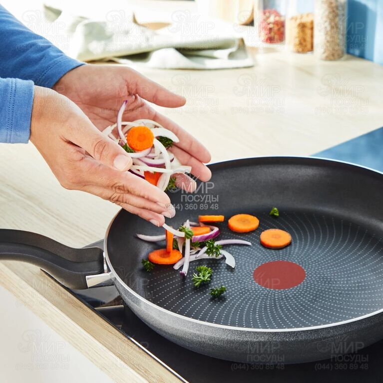 Сковорода So' Light от Tefal изготовлена из алюминия. Благодаря новой технологии Light Tech на 43% легче (по сравнению с классической индукционной посудой Unlimited от Tefal). Покрытие с титановыми частицами обеспечивает отличные антипригарные свойства, что гарантирует легкое очищение, а также сохраняет питательные вещества и вкус пищи. Улучшенная технология Thermo-Signal меняет цвет на равномерный красный, когда сковорода достигает идеальной температуры для начала приготовления, гарантируя отличный результат каждый раз. Эргономичная ручка с местом для большого пальца обеспечивает комфортное удержание и дополнительное удобство при приготовлении.