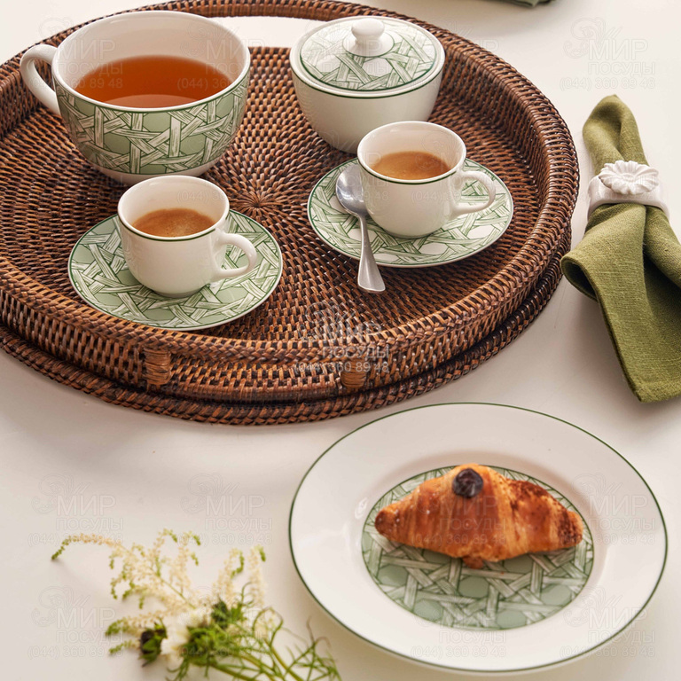Коллекция Intrigo от итальянского производителя La Porcellana Bianca представляет собой современную интерпретацию фермерского стиля, выполненную из белого фарфора с выразительным зелёным декором. Особенностью серии являются элементы с натуральными акцентами, например, крышки из дуба — сочетание чистого фарфора и дерева создаёт тёплый, уютный образ, подходящий как для будничной, так и для праздничной сервировки.