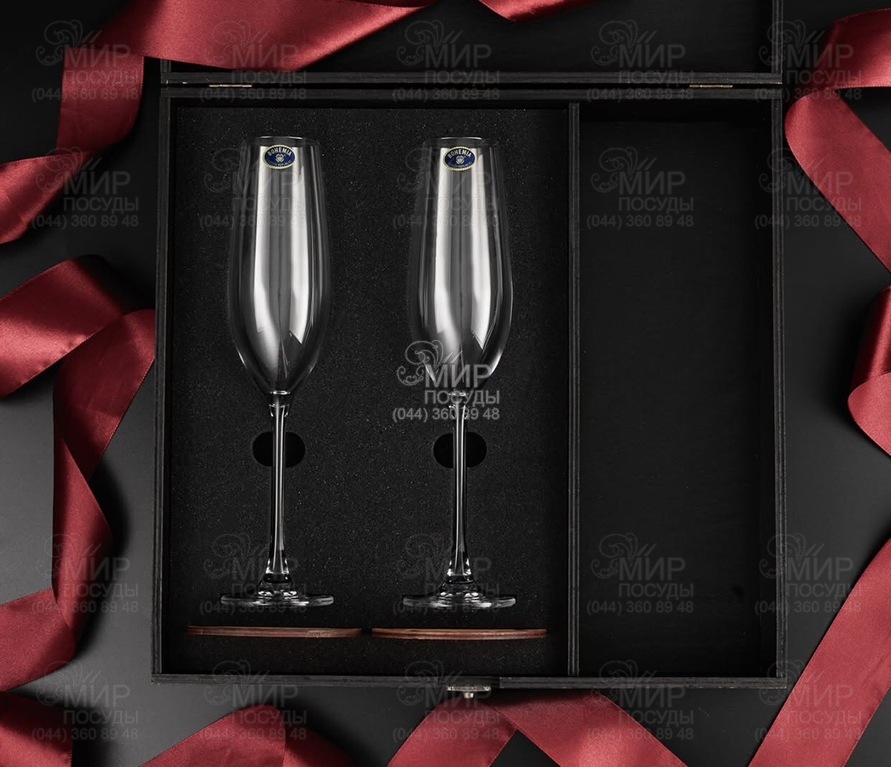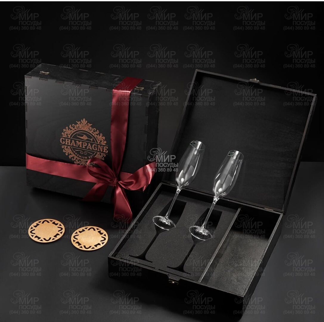 Качественная деревянная подарочная упаковка в темном дереве. Внутренняя часть - это мягкий бархатный ложемент, на котором размещены 2 бокала и 2 костера. А также есть отсек, в который Вы сможете добавить бутылку любимого шампанского (шампанское в комплект не входить).