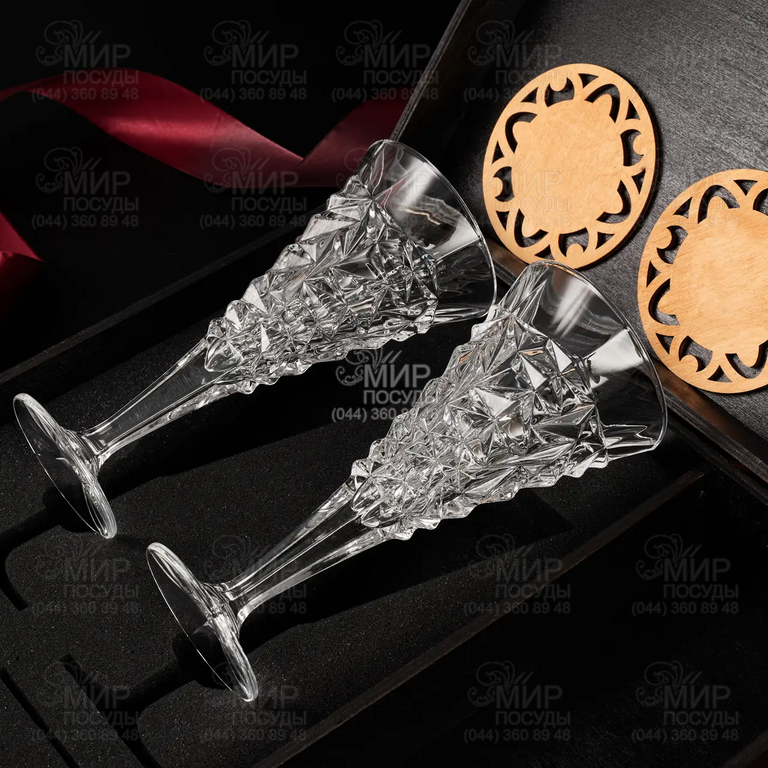 Изысканный подарочный набор станет символом элегантности и хорошего вкуса. В комплект входят два хрустальных бокала с оригинальной огранкой, которые отлично подходят для вина. Все расположено в стильном деревянном футляре с мягкой внутренней отделкой, что защищает бокалы от повреждений и придает набору роскошный вид. Также есть отсек, в который Вы сможете добавить бутылку любимого вина (вино в комплект не входить).