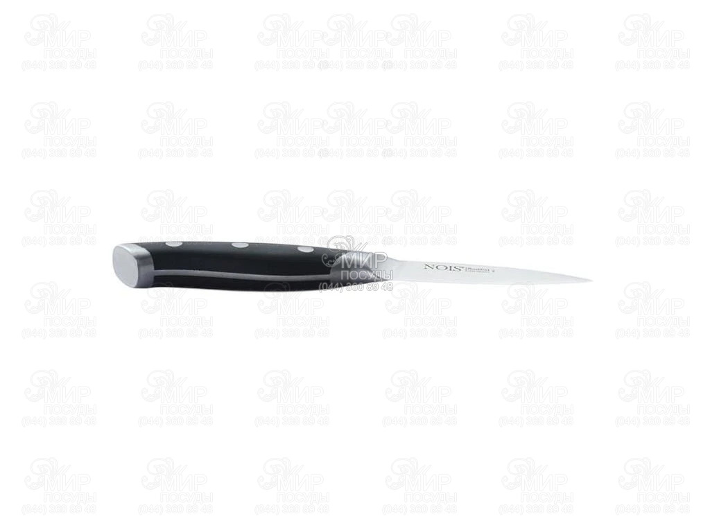 Нож от польского производителя Nois изготовлен из катаной нержавеющей стали X50CrMoV15 твёрдостью 55 +/- 1 HRC. Конструкция и форма ножа обеспечивают удобство использования. Острое, тонкое лезвие легко режет продукты различной твёрдости. Гладкая, тщательно отполированная поверхность лезвия обеспечивает точную нарезку, не деформируя продукт. Место соединения лезвия с рукояткой предотвращает скопление бактерий и грязи. Выступ между лезвием и рукояткой обеспечивает надёжную опору для указательного пальца и улучшает баланс, позволяя работать долго без усталости.