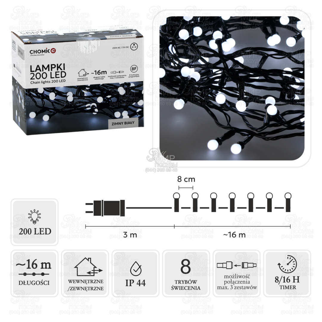 Гирлянда с 200 диодами холодного белого света. Благодаря расположению диодов через каждых 8 сантиметров они создают невероятно эффектное и уютное свечение, идеально подходящее для рождественского декора интерьера.