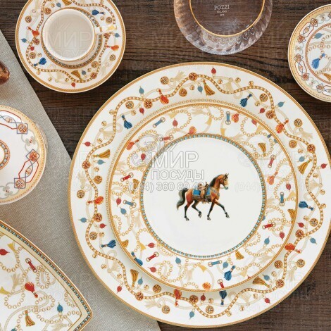 Коллекция Cheval от Pozzi Milano – это воплощение аристократического стиля и изысканной итальянской элегантности. Декор с лошадьми, кожаными ремнями и золотыми цепочками напоминает мир конного спорта, добавляя сервированию нотку благородства и шарма. Изысканное сочетание белого фарфорового фона с золотистыми, синими и красными акцентами создает роскошную атмосферу на любом столе.