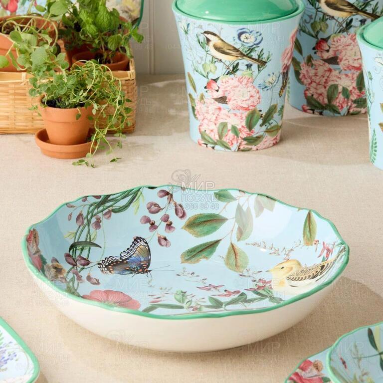 Салатник Флора от американского бренда Certified International изготовлен из сверхпрочной керамики и покрыт износостойкой глазурью. Емкость украшена яркими цветочными узорами, вдохновленными природой, в оттенках красного, синего, желтого и зеленого, дополненными деталями в виде бабочек, стрекоз и птиц.