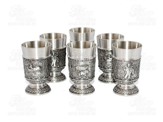 Набор рюмок от немецкого производителя Artina SKS изготовлен из пищевого олова. Во всем мире продукция данной компании славится прекрасной ручной работой мастеров - для достижения совершенно гладкой поверхности бокалов, кружек, графинов их полируют вручную. Стенки изделий украшены барельефами картин.