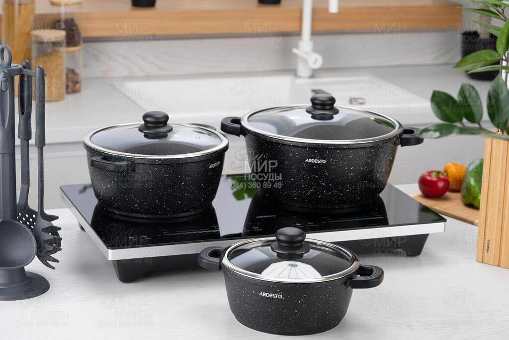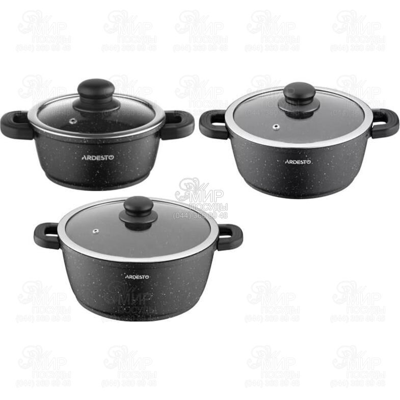 Набор посуды Gemini Anzio от Ardesto изготовлен из алюминия с антипригарным покрытием. Особенностью изделий являются съемные силиконовые накладки на алюминиевых ручках, которые обеспечивают комфортное и безопасное перемещение кастрюль даже когда они разогреты.