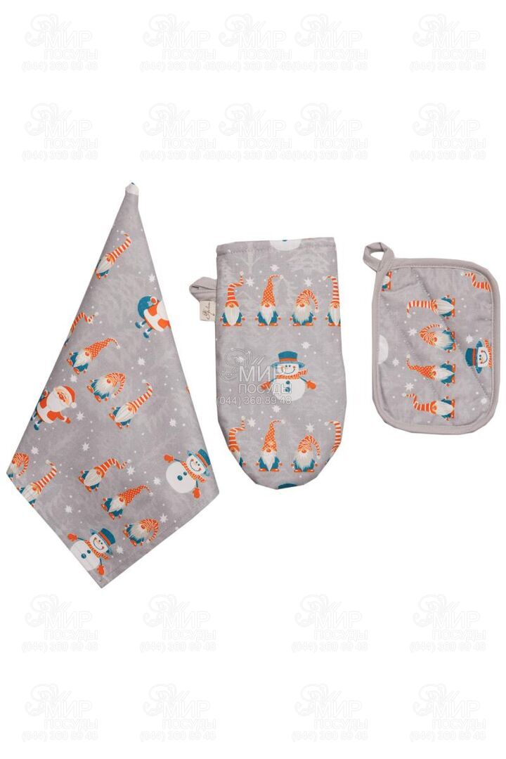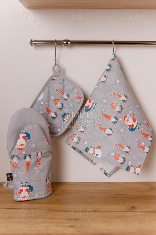 Мир посуды - Кухонные аксессуары - Рукавицы, прихватки, фартуки - Набор прихваток + полотенце кухонное Happy Holidays на сером 4823093452657