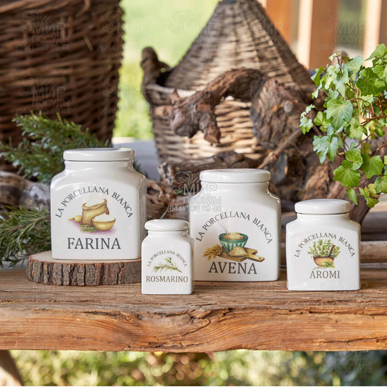 Коллекция Conserva от La Porcellana Bianca перенесет вас в мир маленького тосканского городка с обаянием маленьких, уютных улочек. Кухонные аксессуары этой коллекции выполнены из высококачественного фарфора, который увлекает винтажным стилем. Подберите необходимые емкости в едином дизайне: для соли, сахара, печенья, растительного масла, кофе, лука и чеснока. Декоративные изображения и надписи помогут догадаться о назначении отдельных баночек.