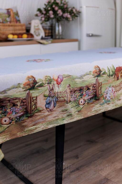 Пасхальная коллекция гобелена Настроение от украинского бренда Прованс — это настоящая весенняя история, сотканная в ткани. Дизайн наполнен атмосферой уютного деревенского пейзажа: зеленые лужайки, декоративные ограждения, цветущие сады, праздничные корзины с писанками и милый пасхальный кролик создают ощущение теплой семейной традиции и светлого праздника. Панорамный сюжет расположен вдоль края изделий, что придает скатерти особую выразительность и делает ее центральным акцентом сервировки. Нежное голубое основание гармонично сочетается с пастельными оттенками зеленого, розового и кремового, создавая легкое, свежее весеннее настроение. Гобеленовое переплетение обеспечивает объемность рисунка и глубину цвета – изображение не нанесено поверхностно, а выткано в структуре ткани. Благодаря этому изделия отличаются плотностью, долговечностью и стойкостью к износу. Коллекция идеально подходит для праздничного стола на Пасху и создания сезонного декора в доме. В серии представлены скатерти, декоративные наволочки и текстильные аксессуары, легко комбинирующиеся между собой, формируя завершенную композицию.