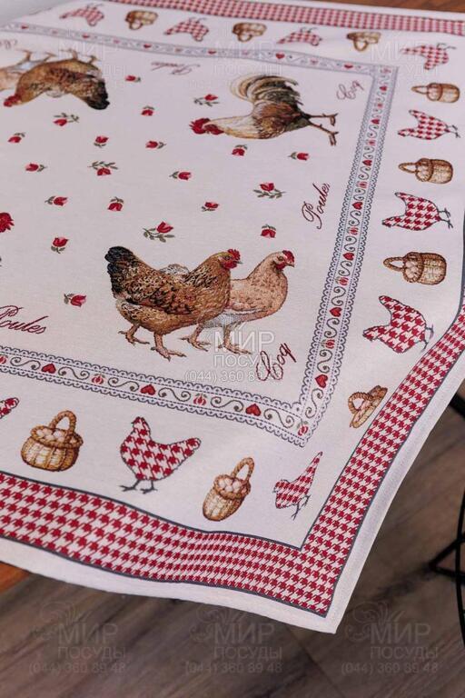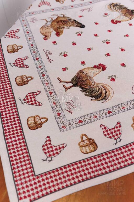 Коллекция гобеленового текстиля Благополучие от украинского бренда Прованс, с колоритным петухом, наполняет кухню атмосферой тепла, ароматом свежей выпечки и ощущением настоящего домашнего уюта. Дизайн вдохновлен фермерской тематикой: выразительные изображения петуха и курочки, мелкий орнамент в клетку, декоративные бордюры и теплая красно-молочная гамма создают атмосферу домашнего тепла и гастрономического уюта. Центральные композиции гармонично дополняются орнаментальными рамками и мелкими тематическими деталями, благодаря чему каждое изделие выглядит завершенным и декоративно насыщенным. Насыщенный красный цвет придает акцент, делая текстиль ярким элементом кухонного интерьера. Гобеленовое переплетение формирует объемный, глубокий рисунок, не наносимый поверх ткани, а сотканный в ее структуре. Благодаря этому изделия отличаются плотностью, долговечностью и износостойкостью, сохраняя форму и цвет даже при активном использовании. В серии представлены скатерти, салфетки, декоративные наволочки, прихватки, дорожки и кухонные аксессуары, легко комбинирующиеся между собой, создавая цельный ансамбль в стиле кантри или прованс.