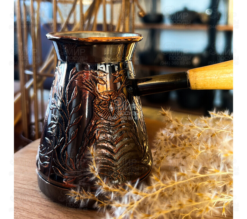 Турка украинского производства изготовлена из меди, идеально сочетает в себе прочность и стиль. Пищевое олово внутри защищает от контакта с медью и оставляет чистый вкус, а наружное покрытие из черного никеля придает современной элегантности. Деревянная ручка, надежно припаянная через медную трубку, делает процесс приготовления кофе удобным и безопасным.