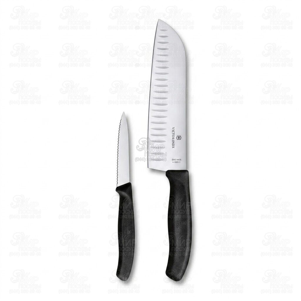Швейцарский набор ножей Swiss Classic от Victorinox изготовлен из нержавеющей стали. Нож для чистки овощей и фруктов отлично справится с такими точными задачами, как чистка, удаление сердцевины и деликатная нарезка. Нож-санток – настоящий нож шеф-повара, который виртуозно справится с нарезкой кубиками и измельчением, а благодаря рифленому лезвию удобно нарезать мясо, жирную рыбу, сыр или овощи без прилипания продукта к лезвию. Этот незаменимый дуэт ножей обеспечит эффективность вашей кухни.