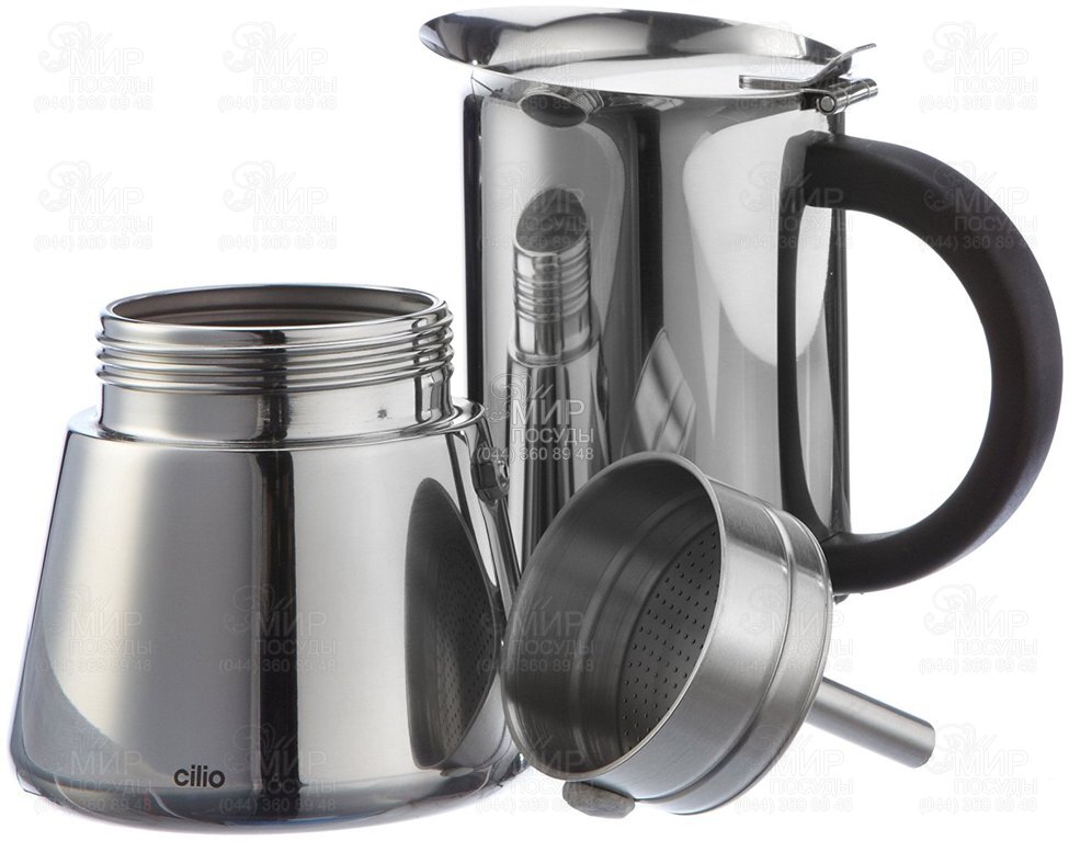 Гейзерная кофеварка современного немецкого производителя посуды Cilio позволяет в любой момент насладиться любимым бодрящим напитком. Кофеварка изготовлена из нержавеющей стали с зеркальной полировкой. Удобная ручка из термостойкого пластика хорошо лежит в руке. Откидная крышка плотно прилегает к емкости. Приготовить кофе в данном сосуде очень просто: наполните нижнюю часть кофеварки водой, добавьте молотый кофе в сетчатый фильтр. Затем плотно закрутите емкость и поместите ее на плиту. Когда раздадутся типичные булькающие звуки и запах свежего кофе, ваш эспрессо готов. Подходит для использования на всех типах плит, включая индукционные.