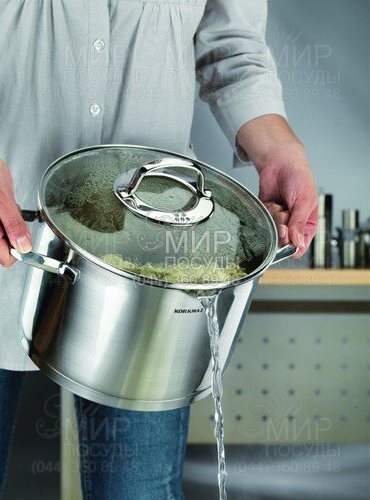 Набор посуды из серии Steama турецкого производителя посуды Korkmaz отличается расширенными функциями и высоким качеством. Посуда изготовлена из хромникелевой нержавеющей стали марки 18/10. Инкапсулированное толстое дно превосходно распределяет тепло по всей поверхности, экономит энергию, необходимую для нагрева посуды. На внутренние стенки кастрюль нанесена шкала объема. Так же посуда снабжена удобным носиком, позволяющим переливать содержимое, не оставляя брызг. Крышки изготовлены из жаростойкого стекла, обрамленного широким стальным кольцом. В металлическом ободе крышки с противоположных сторон расположены две группы отверстий, крупные и мелкие. Они предназначены для слива жидкости из посуды. Для этого необходимо повернуть крышку так, чтобы отверстия нужного диаметра оказались точно напротив сливного носика. Широкие стальные ручки не нагреваются, надежно прикреплены к посуде точечной сваркой. Посуда из нержавеющей стали подходит для всех типах плит, включая индукционные, так же может быть использована в духовом шкафу. Можно мыть в посудомоечной машине.