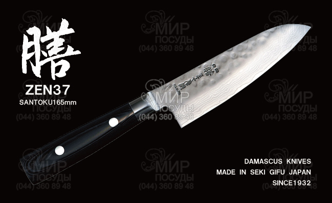 В основе клинков ножей серии ZEN лежит высококачественная японская сталь VG10, которая с обеих сторон закована в высокоуглеродистую сталь (по 18 слоев с каждой стороны). В результате получается пакет из 37-ми слоев. Ножи этой серии обладают превосходными режущими качествами, а закалка стали до твердости 61HRC по Роквеллу позволяет долгое время хранить превосходную заточку. Стилистическое решение, в виде следов ковки в верхней части клинков, делает ножи ZEN необычайно красивыми и уникальными.