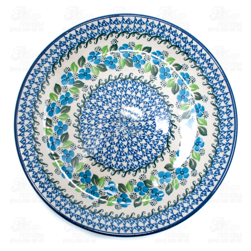 Тарелка подставная Вербена от польского производителя Керамика Артистична изготовлена из жаропрочной керамики с 4-х кратным обжигом. Центр и края декорированы густым ультрамариновым кружевным узором, а середина – орнаментом из плетущихся зеленых листьев и голубых цветков. Изделие раскрашено вручную и является неповторимым и уникальным. Безупречно дополнит любой интерьер и создаст атмосферу любви и уюта.