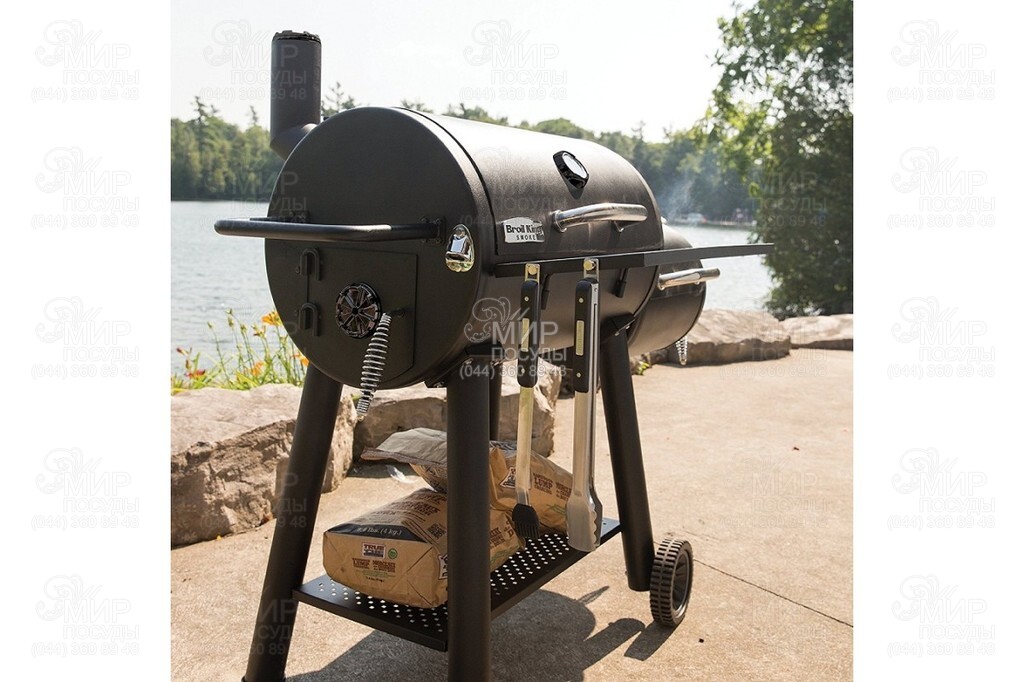 Угольный гриль коптильня Offset Smoker от американского производителя Broil King - это сочетание двух возможностей в одном устройстве, копчения и приготовление традиционных барбекю продуктов на угольном гриле. Для приготовления барбекю блюд, Вам будет доступна большая жарочная чугунная решетка с фарфоровым покрытием в большой жарочной камере. В крышке большой камеры расположен точный высококачественный термометр, который позволит контролировать температуру внутри камеры. Добится нужной температуры, получится используя вентиляционные отверстия. Вторая, малая камера, предназначена для копчения барбекю продуктов независимо от основной камеры. Для работы возле гриля имеется удобный стол-полка, на который Вы можете разместить все необходимые инструменты для приготовления блюд, сами продукты, соусы и другое. По бокам столика располагаются крючки для подвешивания необходимых инструментов. Жарочные камеры имеют съемные зольники, которые легко чистить после работы. Также, удобным является нижняя полка, на которой, к примеру, можно разместить мешки с углем.