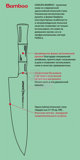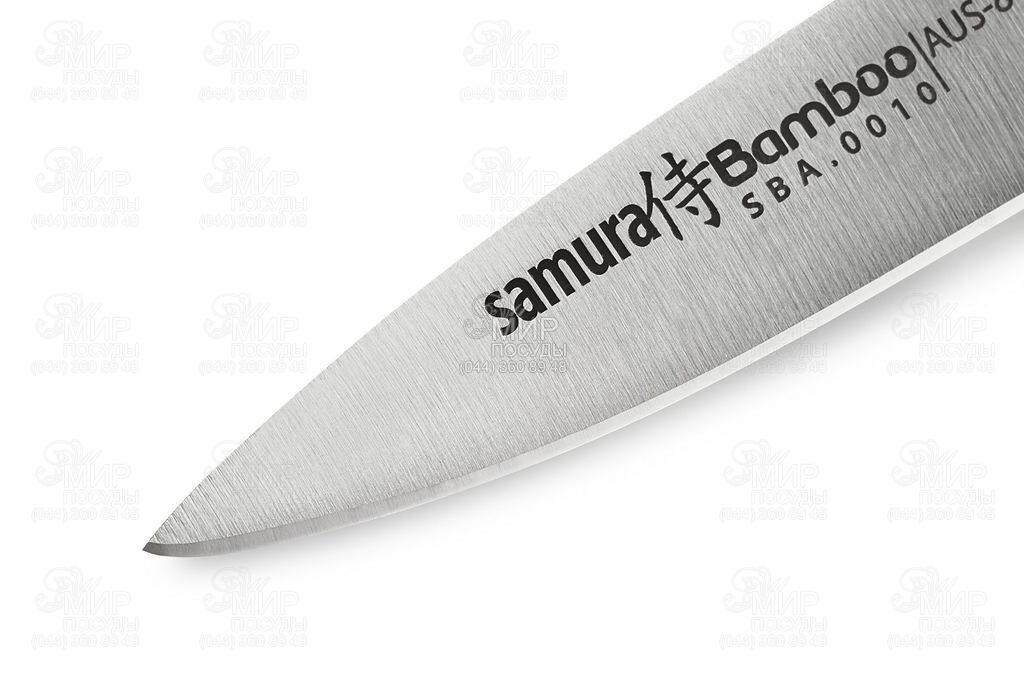 Небольшой и легкий овощной нож с прямым и острым лезвием, очень удобен для чистки овощей и фруктов и нарезки небольших продуктов. Японская нержавеющая cталь AUS-8, из которой изготовлен нож, обладает хорошей коррозионной устойчивостью, отличной стойкостью режущей кромки, легко полируется и шлифуется. Уникальная металлическая рукоятка в форме бамбука препятствует скольжению и абсолютно гигиенична. Ножи Samura "Bamboo" можно использовать не только дома, но и в профессиональном секторе HoReCa, так как ножи соответствуют всем нормам СЭС для кухонных ножей, используемых на кухнях кафе и ресторанов. Эти ножи можно мыть в посудомоечной машине. Полноценный стальной клинок от лезвия до хвостовика, тонкий обух и легкость ножа, японская эргономичная форма - все это существенно облегчает работу ножом и доставляет максимум удовольствия.