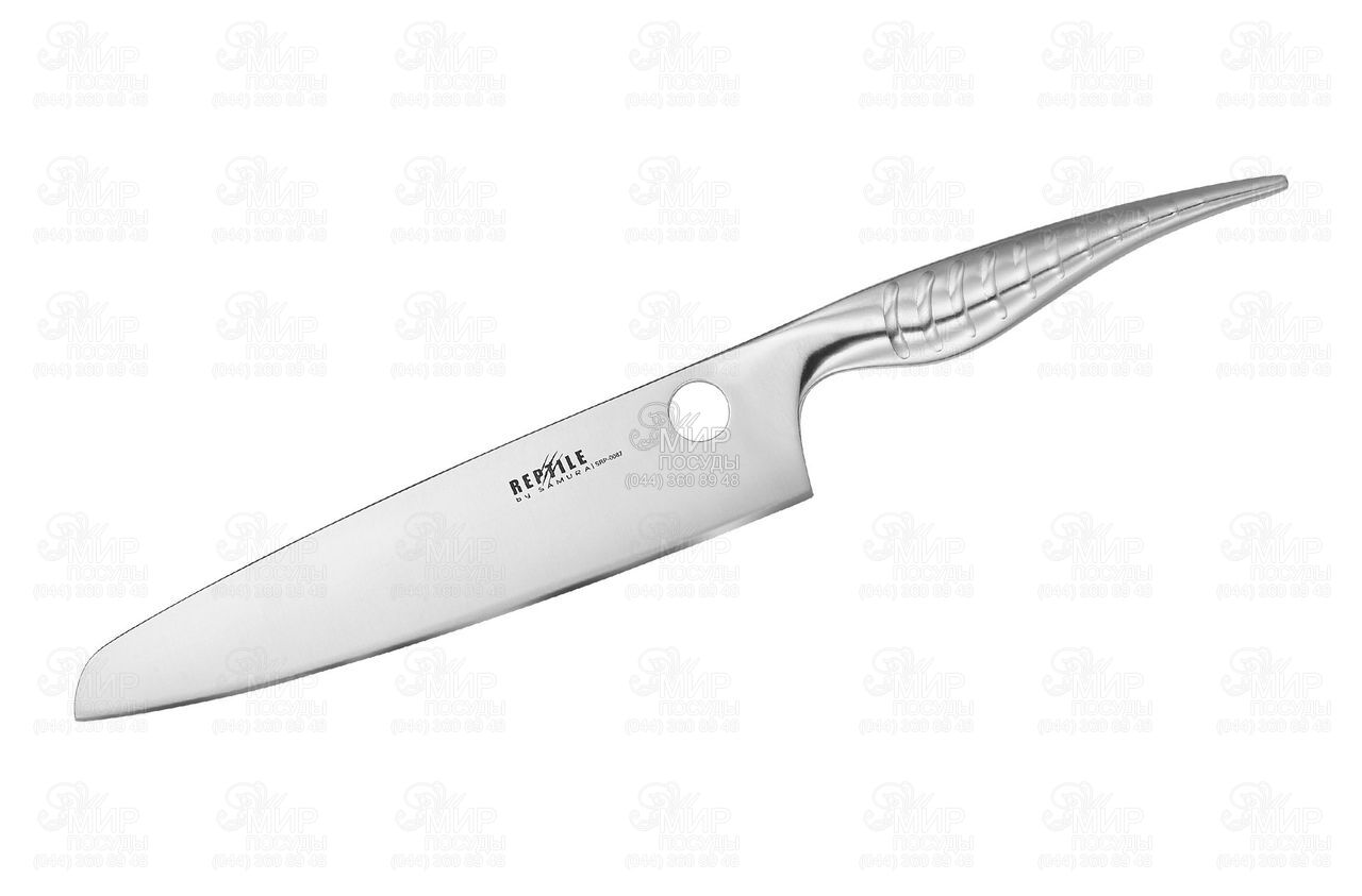 Нож Шеф с оригинальной формой лезвия, которая сочетает в себе элементы европейского шефа и японского Сантоку. Благодаря направленному вниз острию, значительно экономятся силы при работе с ножом. Удобен для большинства видов работ, и практически для всех видов продуктов. Японская нержавеющая cталь AUS-10, из которой изготовлен нож, обладает высокой износостойкостью, прочностью и твердостью, отличной стойкостью режущей кромки. Характерное отверстие на лезвии ножа служит упором для большого пальца при "поварском хвате". Уникальная эргономичная металлическая рукоятка в форме хвоста рептилии адаптируется под любую руку, абсолютно гигиенична, а благодаря характерным ребрам - препятствует скольжению и буквально "влипает" в руку. Суперсовременные кухонные ножи серии "Reptile" - это ножи для истинных эстетов и гурманов .
