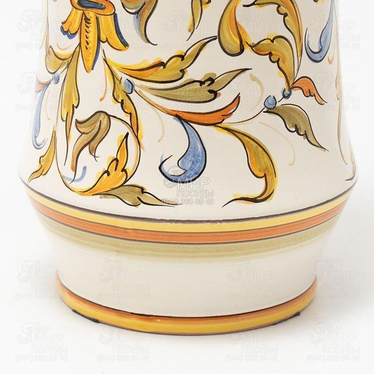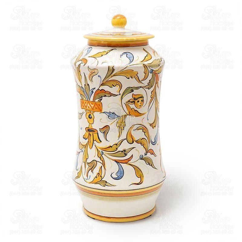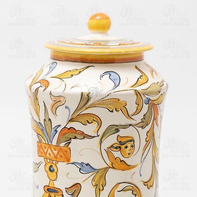 Декоративная ваза или практичная емкость для хранения – этот керамический шедевр от мастеров L´Antica Deruta всегда будет актуален в интерьере комнаты или кухни. Прочные стенки и крышка украшены растительным орнаментом. Глазурованная керамика устойчива к воздействию влаги, ее можно мыть, но только в ручном режиме без использования абразивов и едких веществ. На каждое изделие наносится фирменная подпись бренда, подтверждающая эксклюзивность ручной работы. Даже в рамках одной серии невозможно встретить двух абсолютно одинаковых изделий – нюансы оттенков и тонкости нанесения штрихов делают каждую модель эксклюзивом. Коллекция декоративная и не предназначена для подачи еды.