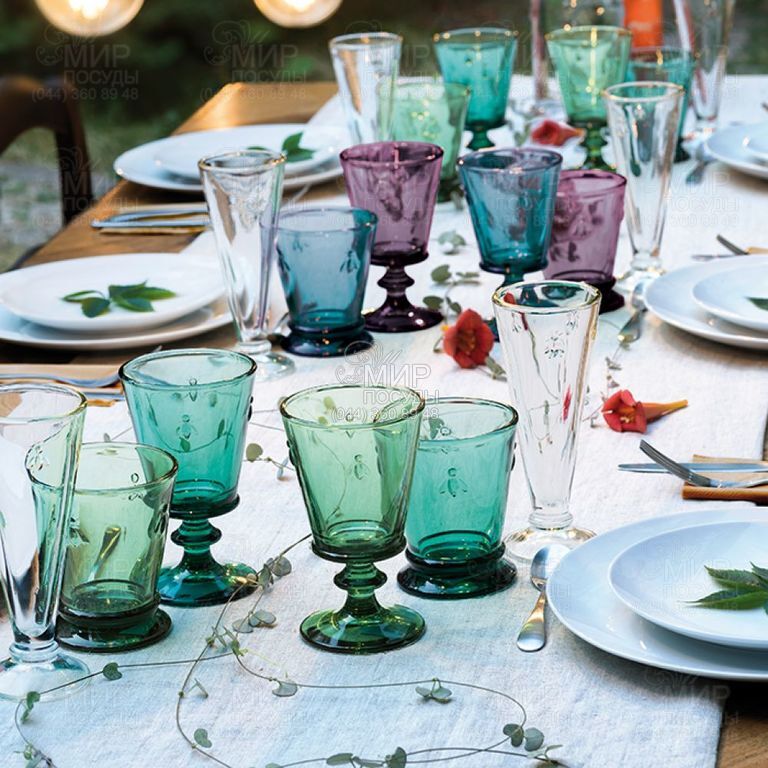 Набор стаканов из серии Abeille. Вдохновением для создания серии Abeille послужило изображение наполеоновской пчелы. Именно Наполеон выбрал пчелу как элемент декора и использовал ее во всех предметах одежды и интерьера. Благодаря особой технологии прессования стекла, посуда из этой серии отличается высокой прочностью.
