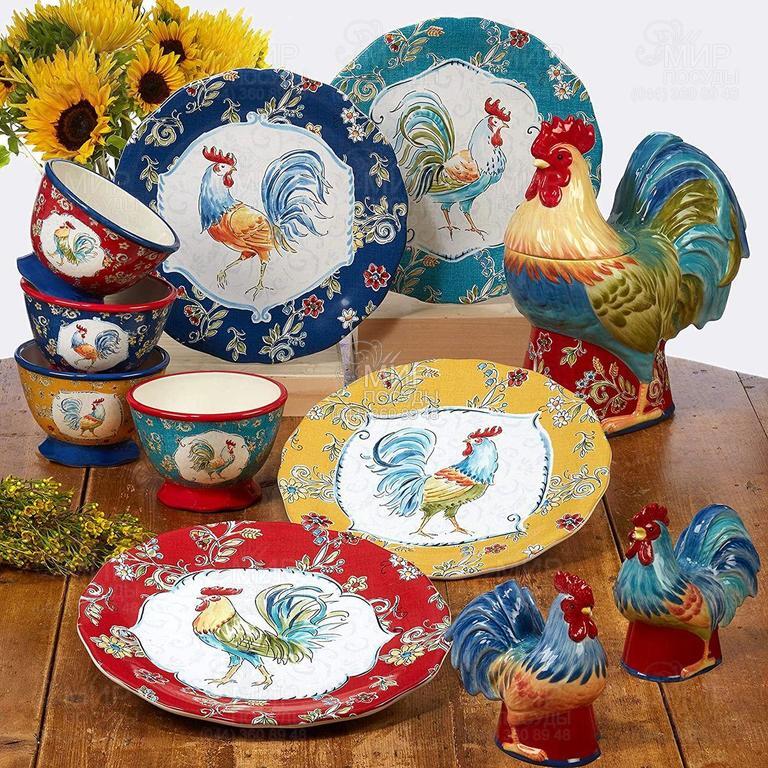 Квадратное керамическое блюдо с плавными волнистыми краями издали можно принять за нарядную салфетку или красочную иллюстрацию в рамке. Автор дизайна – канадская художница Дафна Бриссонне – оформила керамическое изделие с учетом всех тонкостей и деталей, присущих стилю Прованс. Это и трогательные цветочные узоры, украсившие теплый желтый фон, стилизованный под деревенскую полотняную скатерть, и главный символ Франции, гордый и отважный петух, помещенный по центру в красивую белую виньетку. Нарядное блюдо станет роскошным подарком к любому торжеству.