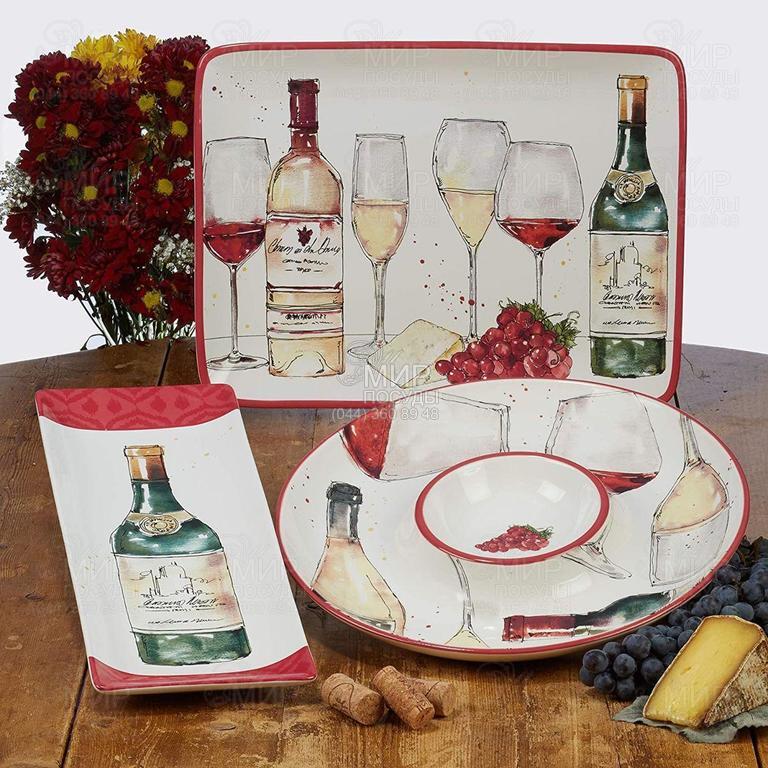 Два белоснежных керамических блюда разного диаметра образуют собой двухъярусную конструкцию благодаря красиво изогнутой металлической подставке – идеальное решение для подачи закусок, фруктов или пирожных во время торжественного мероприятия. Изделия украшены уникальным авторским рисунком от популярной американской художницы Анны Таволетти, которая наделила их всеми необходимыми атрибутами, свойственными винной культуре: прозрачными стаканами с яркими напитками, бутылками и штопором.