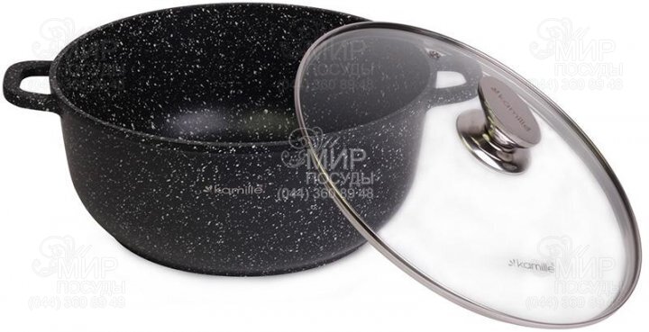 Кастрюля Kamille изготовлена из литого алюминия. Утолщенные алюминиевые стенки жесткие и прочные, не поддаются деформации. Черное мраморное антипригарное покрытие повышает теплораспределительные и антипригарные свойства металла. Посуда подходит для различных кулинарных задач, как для варки жидких блюд, так и для поджарки и тушения мяса или овощей. Литые алюминиевые ручки удобно расположены, удачно выбранный размер ручек, удобен для обхвата руками и переноски посуды. Крышка выполнена из жаропрочного стекла с защитным стальным ободком и пароотводом. На крышке стильная ручка из нержавеющей стали.