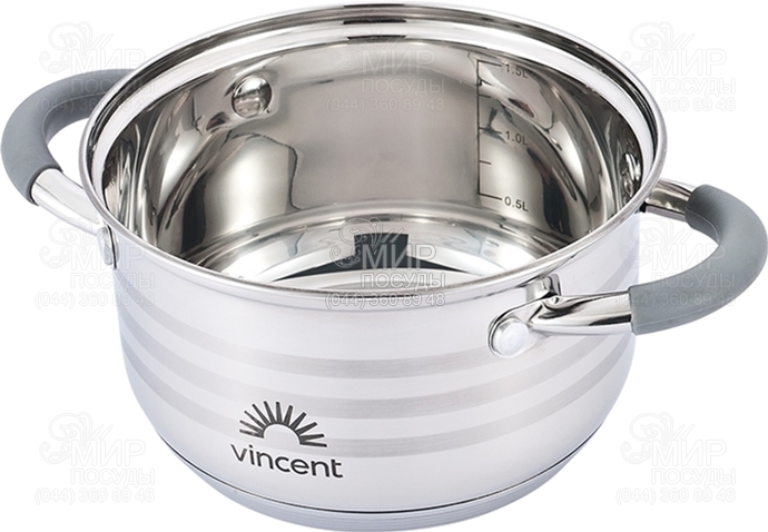 Кастрюля Vincent изготовлена из коррозионностойкой стали с комбинированной полировкой. Внутри нанесена шкала литража. Стальные ручки надежно прикреплены к корпусу клепочным способом. Силиконовые накладки оградят ваши руки от ожога.