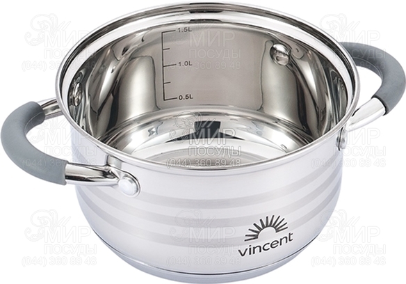 Кастрюля Vincent изготовлена из коррозионностойкой стали с комбинированной полировкой. Внутри нанесена шкала литража. Стальные ручки надежно прикреплены к корпусу клепочным способом. Силиконовые накладки оградят ваши руки от ожога.