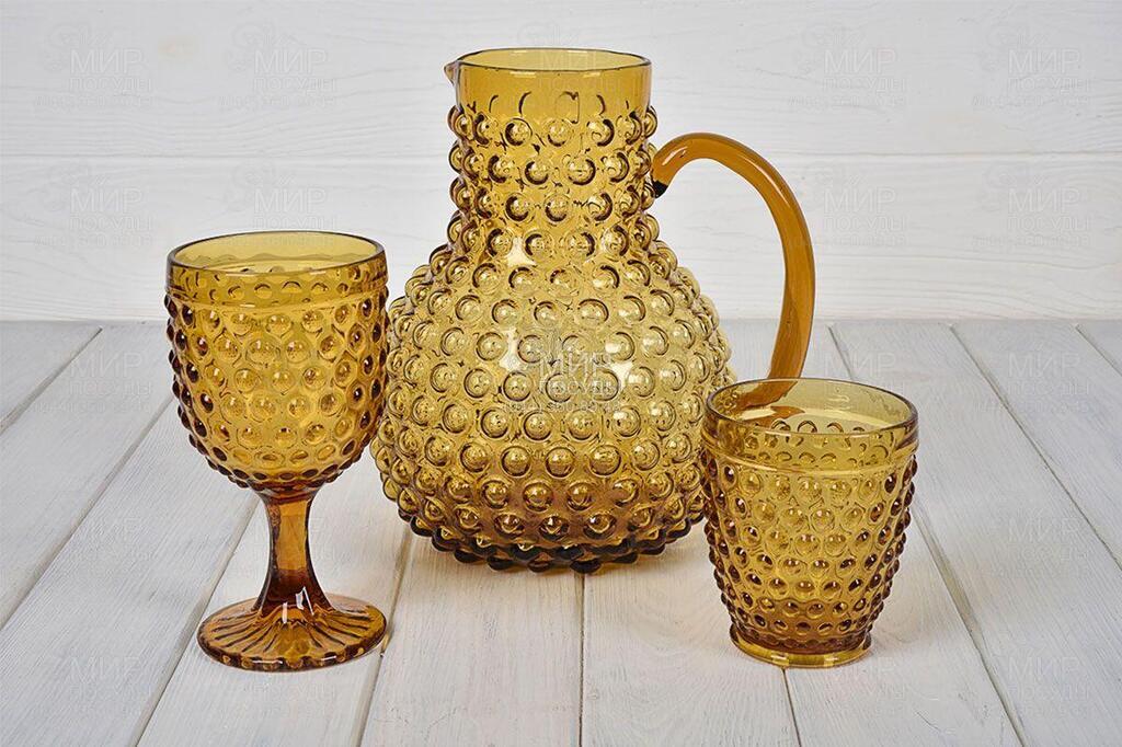 Модель бокалів Ibiza від італійського виробника Maison виготовлена з пастоподібного скла, особлива поверхня, багата на опуклі бульбашки, робить ємності прекрасним доповненням для химерної та оригінальної мізансцени.