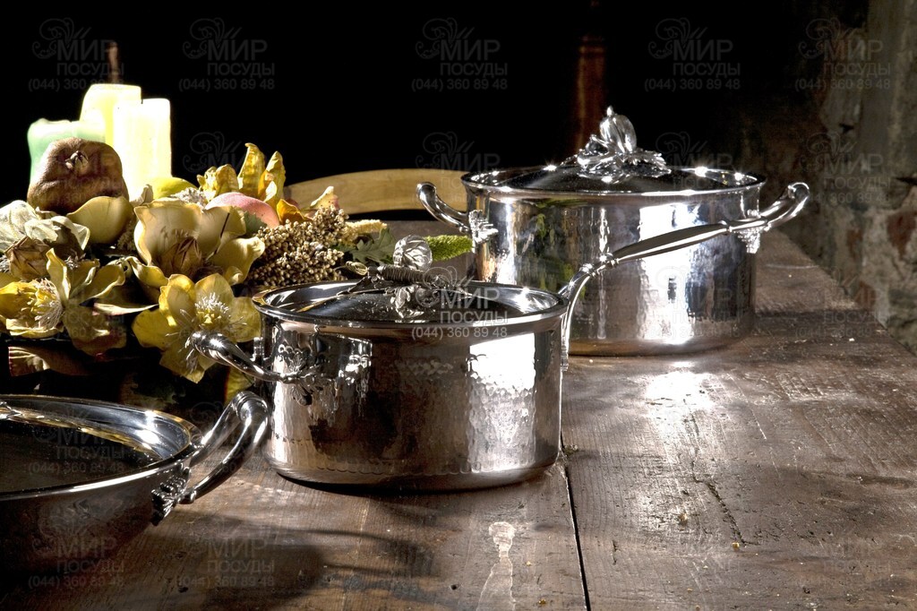 Кухонний посуд Opus Prima зі срібним покриттям. Особлива техніка обробки поверхні карбованими молоточками надає посуду тієї чарівності, яка відрізняє вироблені вручну предмети. Відполірована, як дзеркало, внутрішня частина нержавіючої сталі робить її особливо привабливою. Кришки прикрашені відлитим з латуні овочевим натюрмортом, помідором з горошком і перцем або головкою часнику. Новий посуд не тільки красивий, але й функціональний. Вона підходить для будь-яких видів плит (газових, електричних, керамічних, індукційних) і легко миється в посудомийній машині. Дно та стінки зроблені з кількох шарів нержавіючої сталі (зовнішній 0,4мм та внутрішній 0,4мм) та алюмінію (3шари меджу шарами нержавіючої сталі по 0,7мм кожен) для рівномірного розподілу тепла по поверхні.