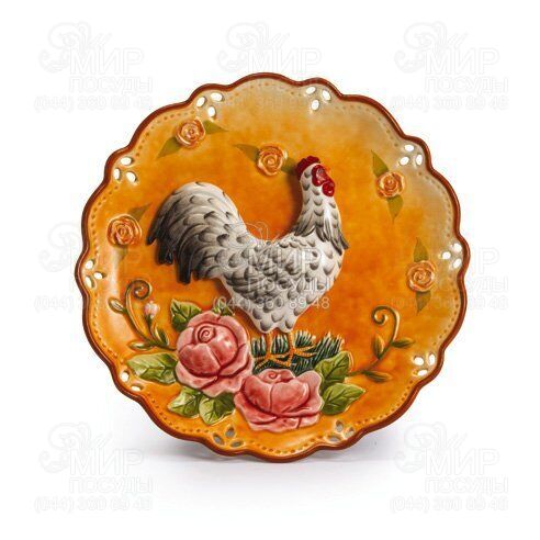 Тарілка з яскравим барвистим півнем та об'ємним ручним ліпленням з високоякісної італійської кераміки, яка відрізняється високою міцністю та естетикою та має вишуканий весняний розпис. Прекрасний подарунок до великодніх свят та стильна інтер'єрна прикраса.