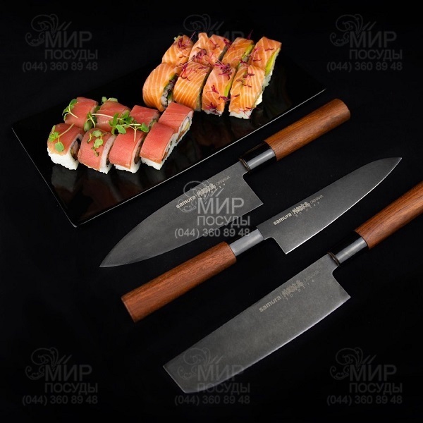 Традиційний японський ніж Сантоку відмінно підходить для нарізки, рубки та подрібнення продуктів. Неймовірно гострий, добре збалансований ніж стане незамінним помічником на домашній та професійній кухні. Японська нержавіюча сталь AUS-8, з якої виготовлений ніж, має гарну корозійну стійкість, відмінну стійкість ріжучої кромки, легко полірується і шліфується. Класична рукоять ножа, виконана з африканського палісандра, зручно лежить у руці та забезпечує максимальний комфорт у роботі. Галтівка stonewash - це декоративна обробка металу в барабані, що обертається за допомогою абразивних матеріалів, що наділяють лезо неоднорідністю і павутинкою дрібних подряпин. Ця обробка запобігає прилипанню продуктів до ножа. Лезо справляється навіть із "капризними" інгредієнтами і не дає їм затриматися на ножі.
