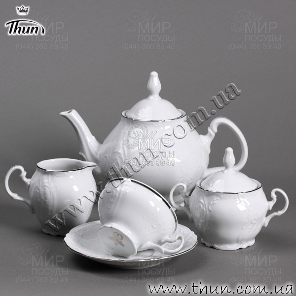 Знаменитая форма выполнена в традиционном стиле Барокко. Форма Бернадотт отличается наиболее длинным рядом отдельных предметов среди всех Чешских производителей фарфора, что позволяет подобрать сервировку стола для любых случаев. Форма отлично сочетается как с декорированным стеклом, хрусталем, так и с простым гладким стеклом. Чайный сервиз расчитан на 6 персон и состоит из 17 предметов. Объем чашки 205 мл.