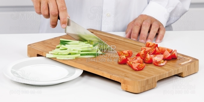 Масивна обробна дошка Azza від Tescoma виготовлена із кількох шарів спеціального натурального бамбука. Відмінно підходить для нарізки, обробки та відбиття продуктів. Виймання на нижній частині дошки дозволяє вставити тарілку або піднос, щоб легко перекласти на них нарізані продукти, обробна дошка нахилена до ринви для стікання рідини. Зручні ручки для безпечного поводження, протиковзна обробка. Мийте під проточною водою, не мийте в посудомийній машині.